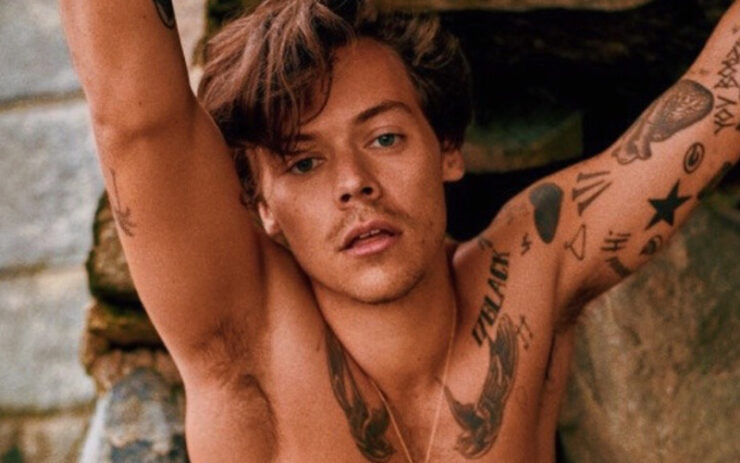 Harry Styles foi flagrado sem camisa e com as tatuagens cobertas no set de seu…